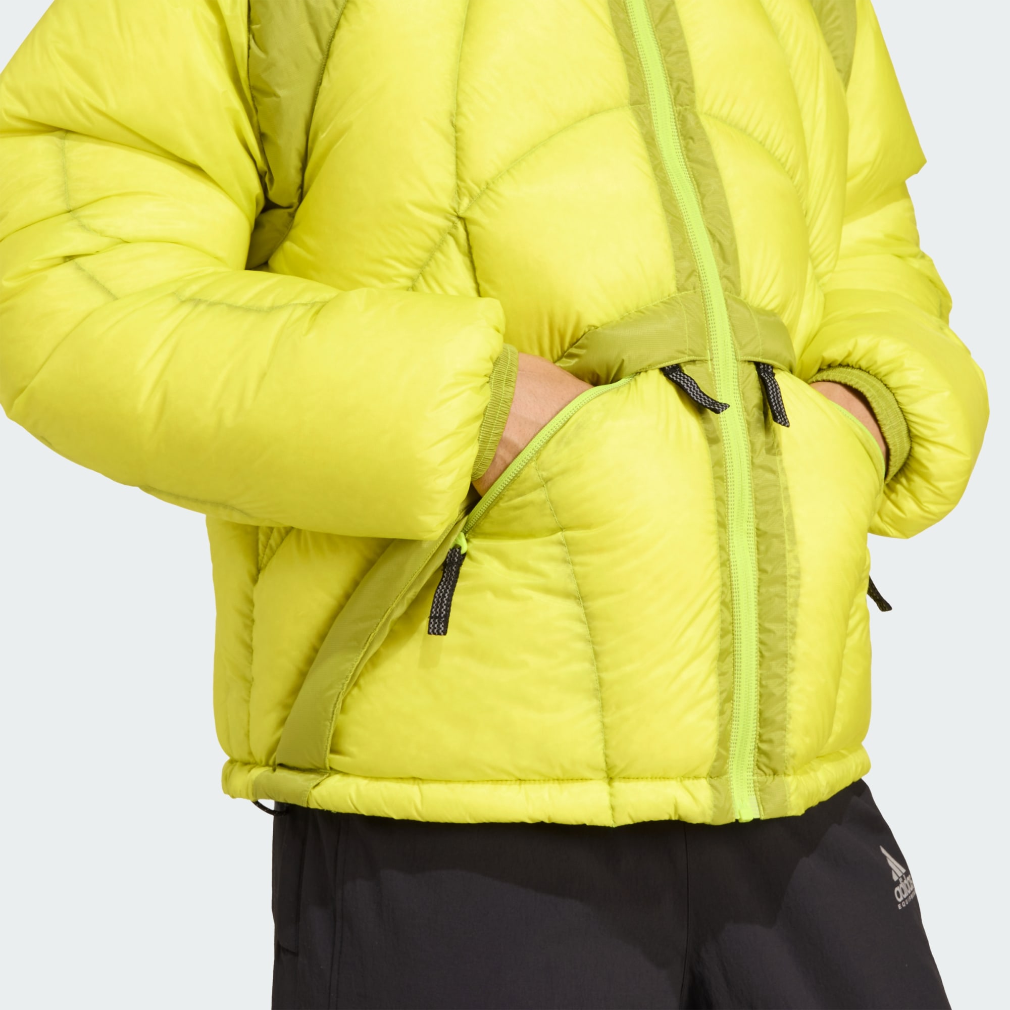 Down jacket with drawcord-adjustable hem and hood for a personalised fit.
