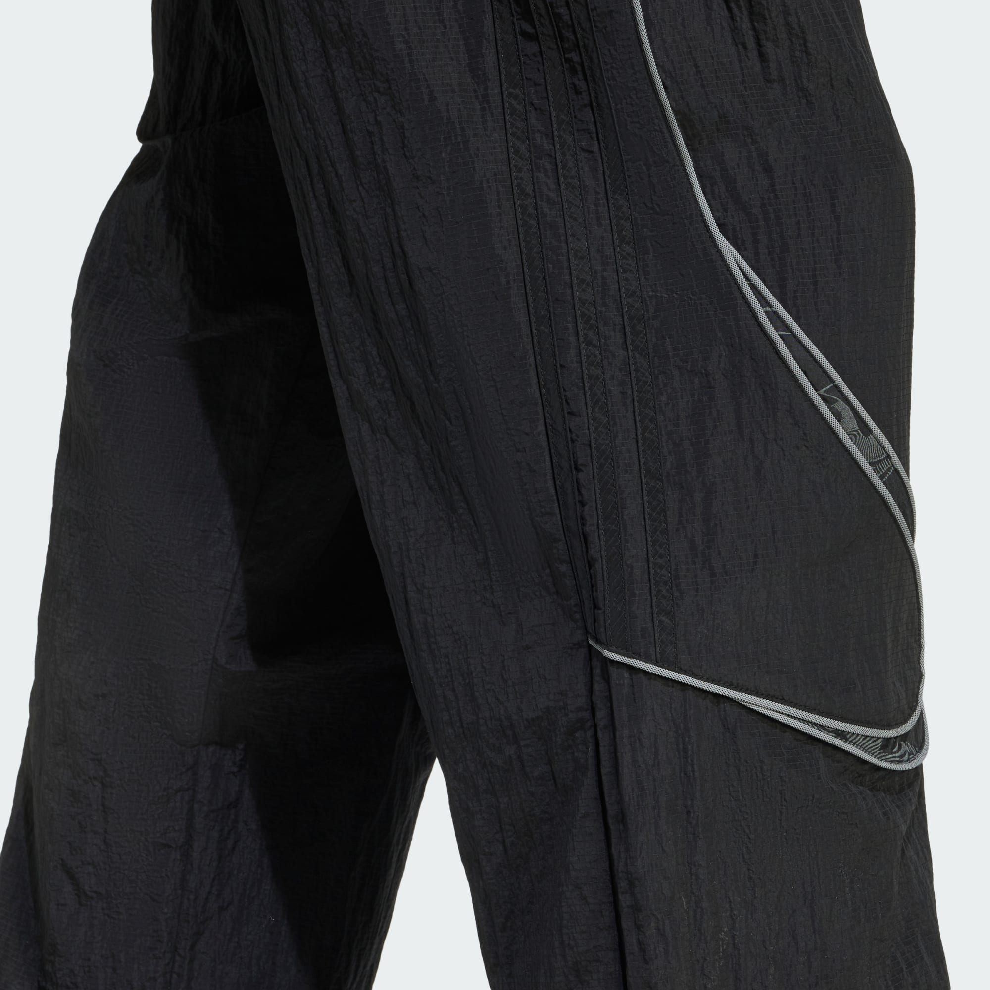 Adilenium Season 4 from adidas Originals dives into the archives to reimagine Teamgeist, the iconic football line that revolutionised the pitch. These loose-fitting track pants highlight the Teamgeist cutline with reflective piping and contrast fabric inserts with a reflective, tribal allover print. They're finished with zip side pockets, an inner drawstring on the waist and bungees at the hem.