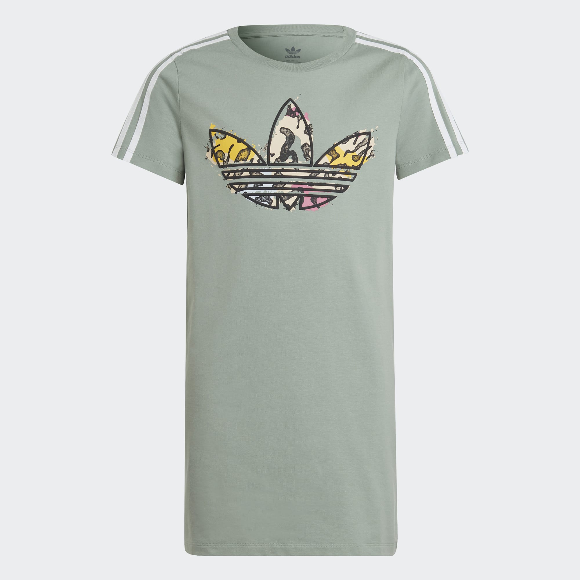 Comfort, first. Style, also first. This juniors' adidas tee dress makes no compromise on either, with a super-soft, stretchy feel and hard-to-miss look. The iconic Trefoil logo flashes fierce energy with a vibrant animal print. Just add trainers, and you're ready to go about your day.
