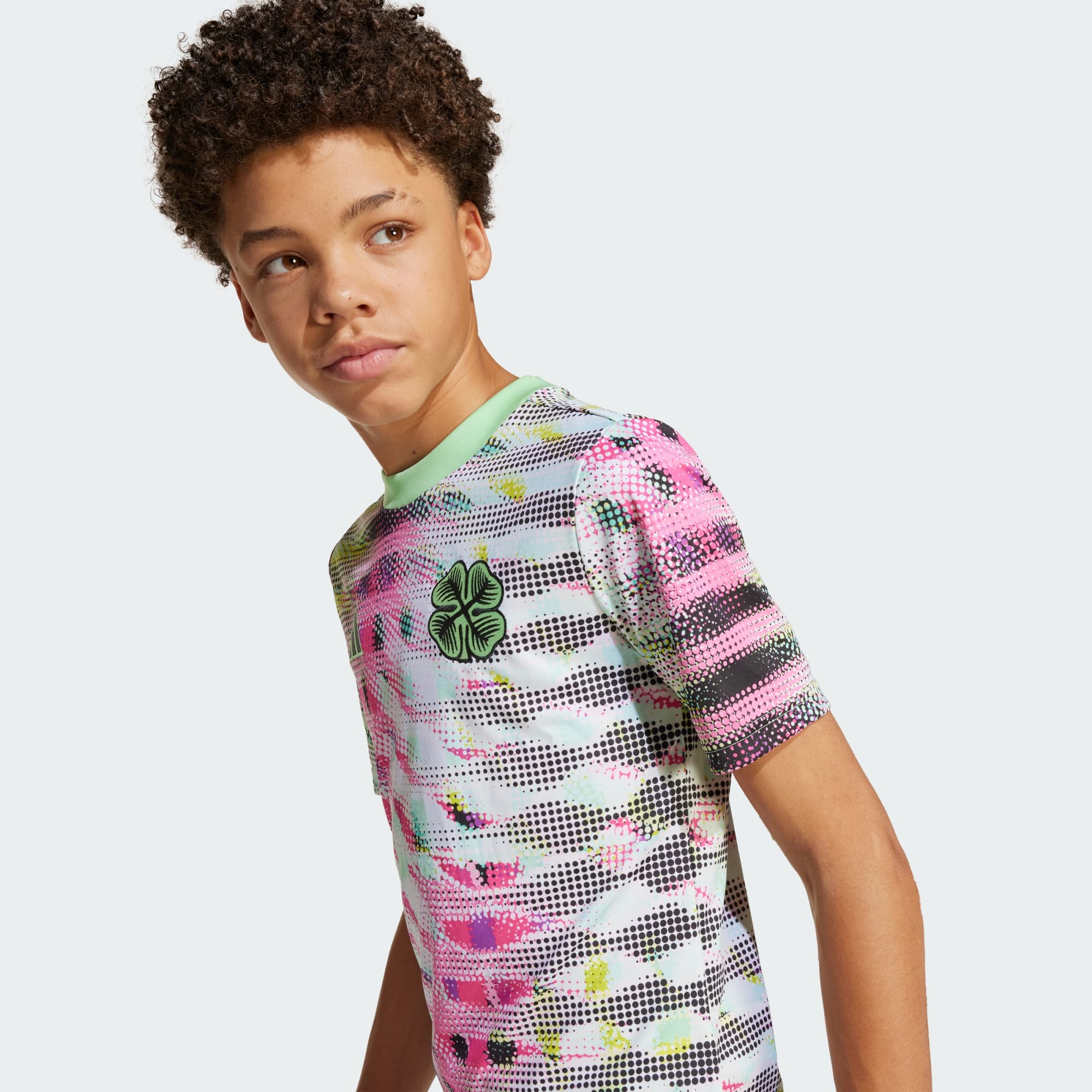 Created for pre-match warm-ups, this juniors' Celtic FC jersey from adidas includes a bold graphic inspired by festival posters. Whether you're celebrating at Celtic Park or jumping to the beat, moisture-managing AEROREADY will ensure you stay comfortable. On the chest, a woven four-leaf clover badge hints at your football fandom.