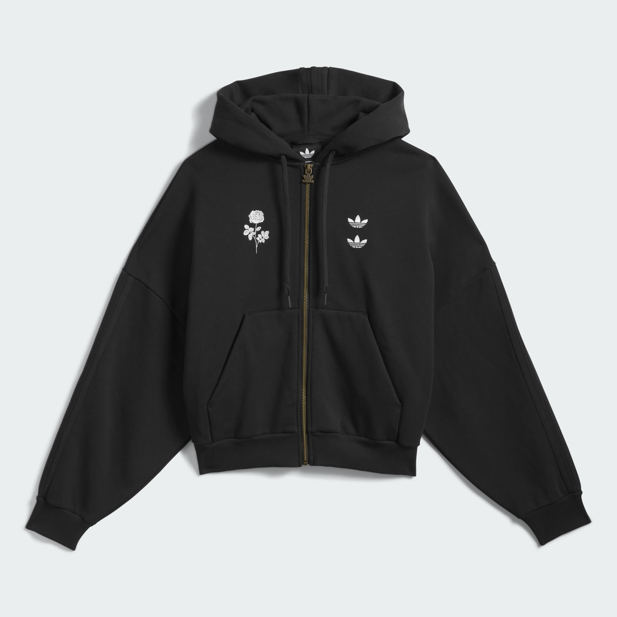 The Chavarria Heavyweight Zip Hoodie is elevated in a heavyweight french terry fabric to provide maximum comfort. The hoodie is designed with voluminous proportions in body and arms. Functional details include a ribbed waistband and cuffs, a hood and kangaroo pocket. The hoodie has a centre front zip closure. Branding is symbolized by embroidered double trefoils of the left chest and applied adidas 3-stripes branding down the sleeves and top of hood. There is a embroidered rose on the right chest and embroidered "Willy Chavarria" and adidas trefoil on the back.