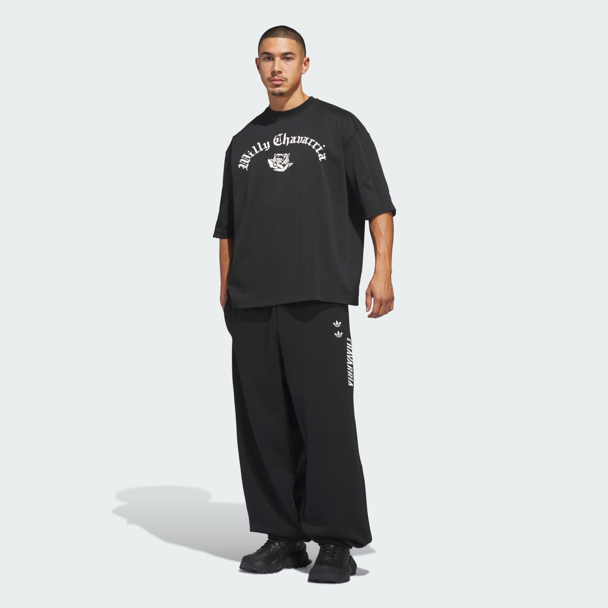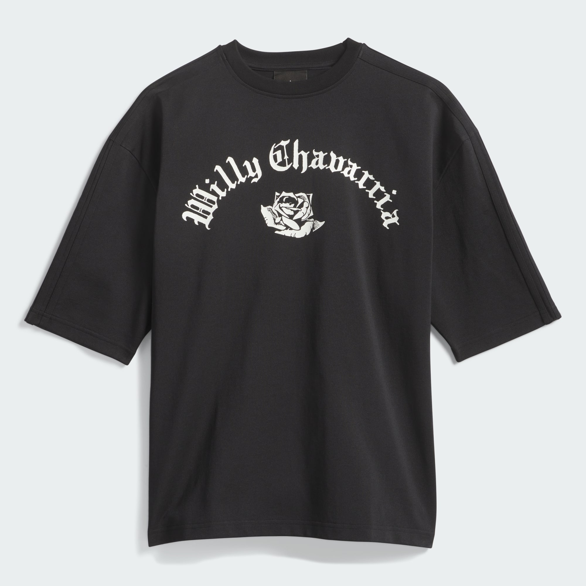 The Chavarria Signature Tee is elevated in a heavyweight jersey fabric to provide maximum comfort and wearability. The short sleeve tee is designed with voluminous proportions in the body. Functional details include a ribbed collar. Branding is symbolized by a printed trefoil and Willy Chavarria wordmark on the centre front, with an embroidered trefoil and "Chavarria" wordmark placed on the back. Adidas applied 3-Stripes run down both shoulders and sleeves.
