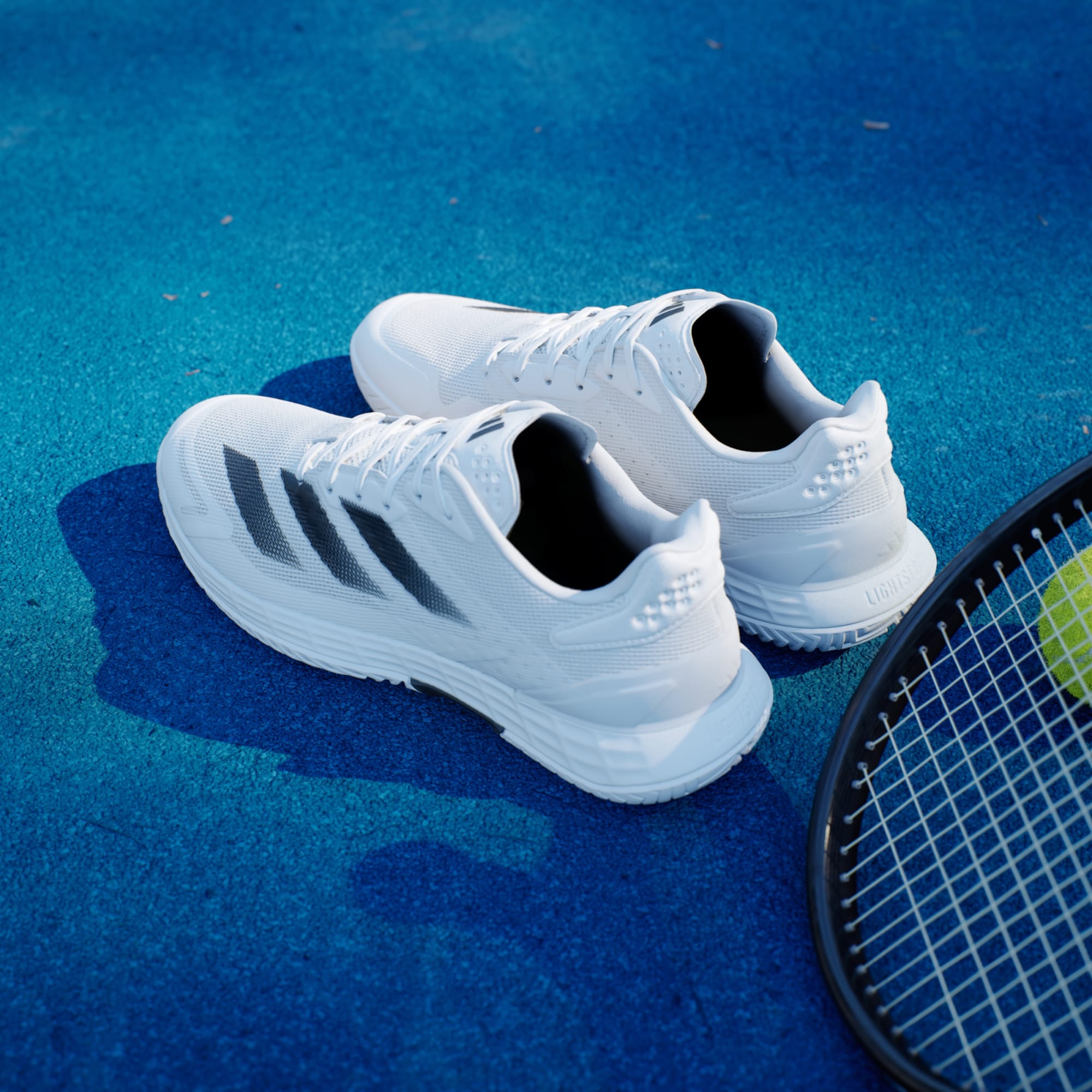 These adidas tennis shoes combine all the essential elements — from targeted underfoot cushioning to a durable outsole — that help you manoeuvre quickly. A Lightstrike midsole absorbs impact in landings while keeping you connected to the ground. The mesh upper allows air to flow around the foot and TPU at the heel secures the fit. Dominate the net or sprint across the baseline with ease. This product features at least 20% recycled materials. By reusing materials that have already been created, we help to reduce waste and our reliance on finite resources and reduce the footprint of the products we make.