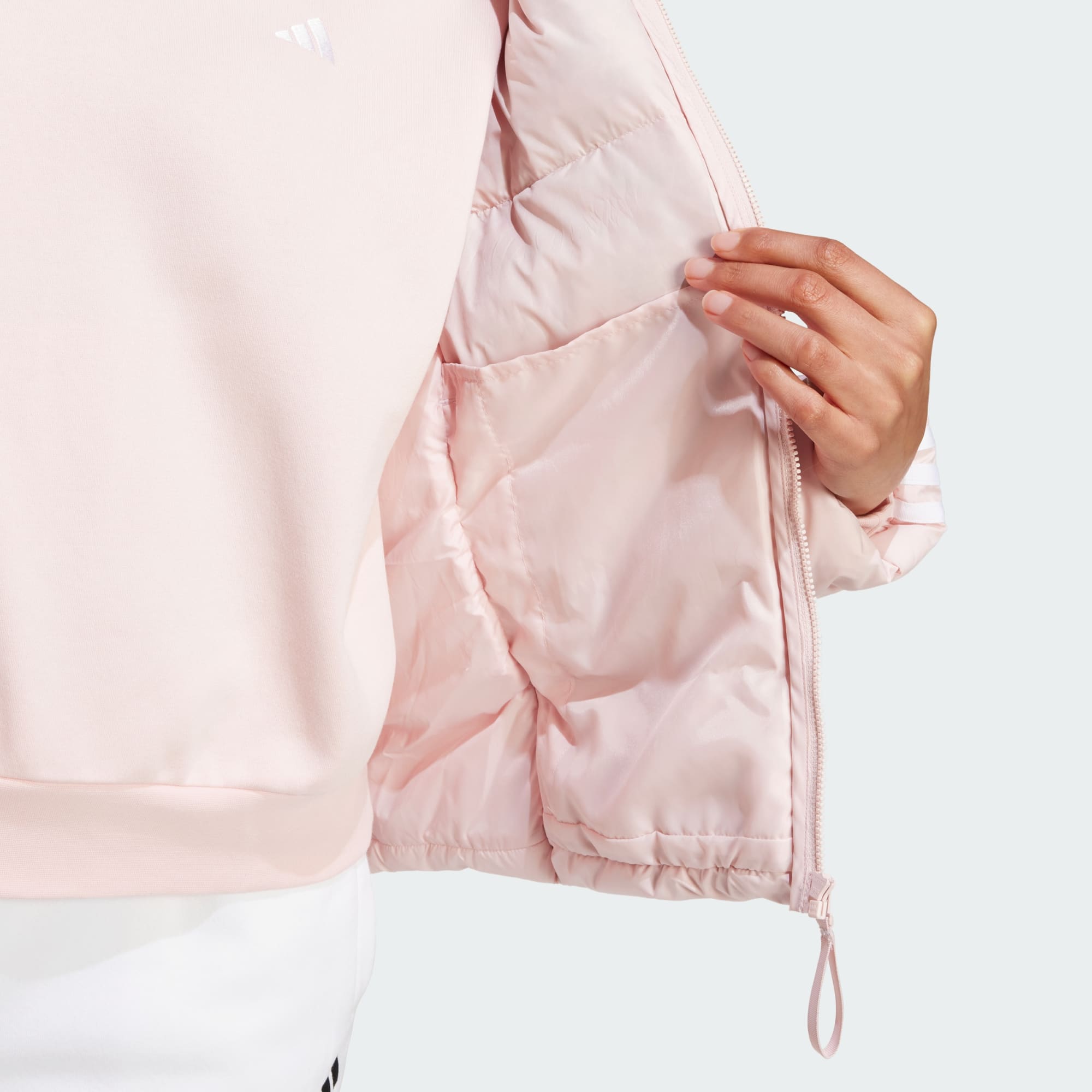 All the warmth you want with none of the bulk you don't. When the weather turns, this adidas jacket streamlines comfort with down fill encased in a durably woven shell. A PFC-free water-repellent finish keeps you dry, and a lined hood keeps you cosy. The front pockets snap shut so your must-haves stay close, and an elastic hem and cuffs keep the warm air in. All that while you stay looking sharp thanks to signature 3-Stripes down each arm. Made with a series of recycled materials, and at least 70% recycled content, this product represents just one of our solutions to help end plastic waste.