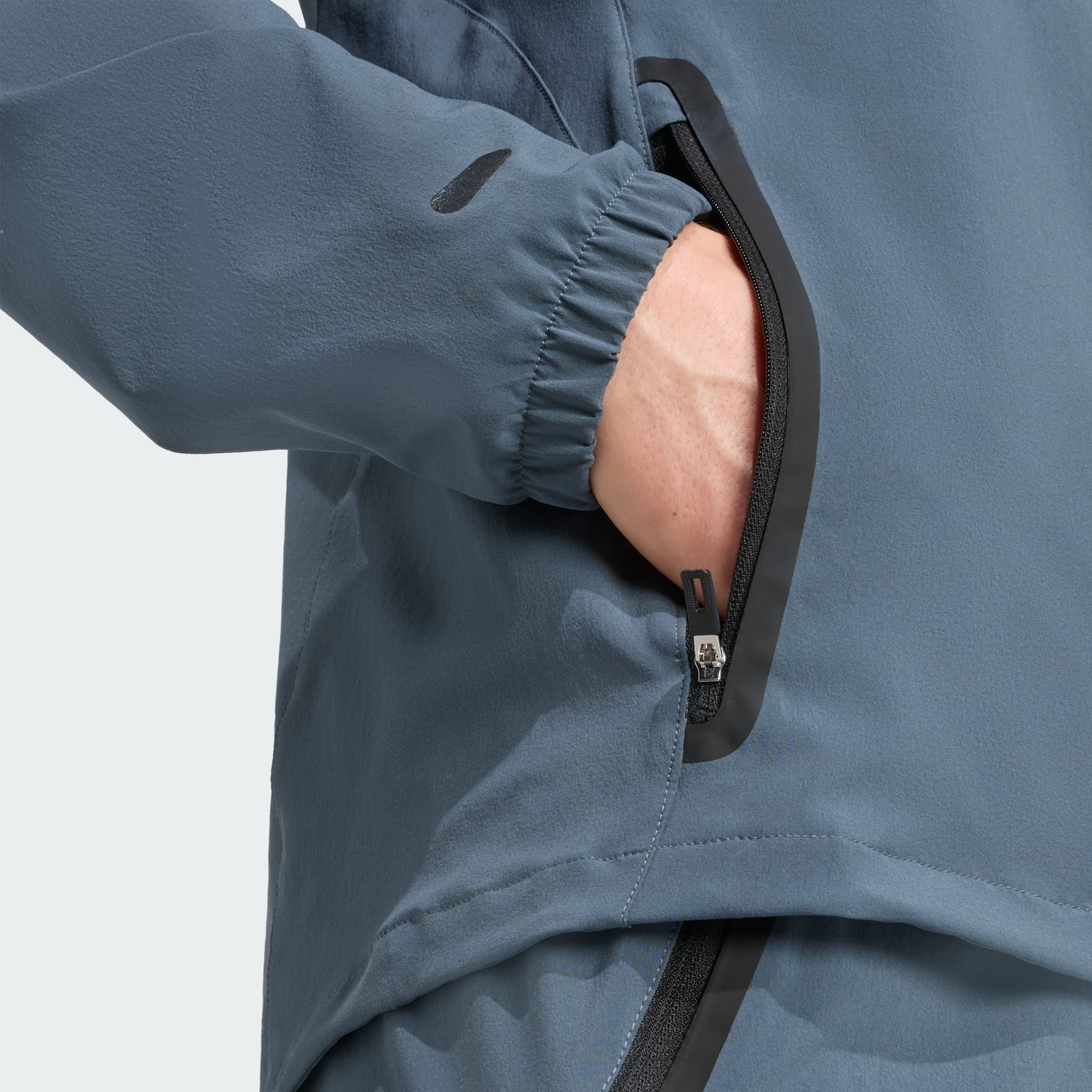 - Full zip with bungee-adjustable hood
