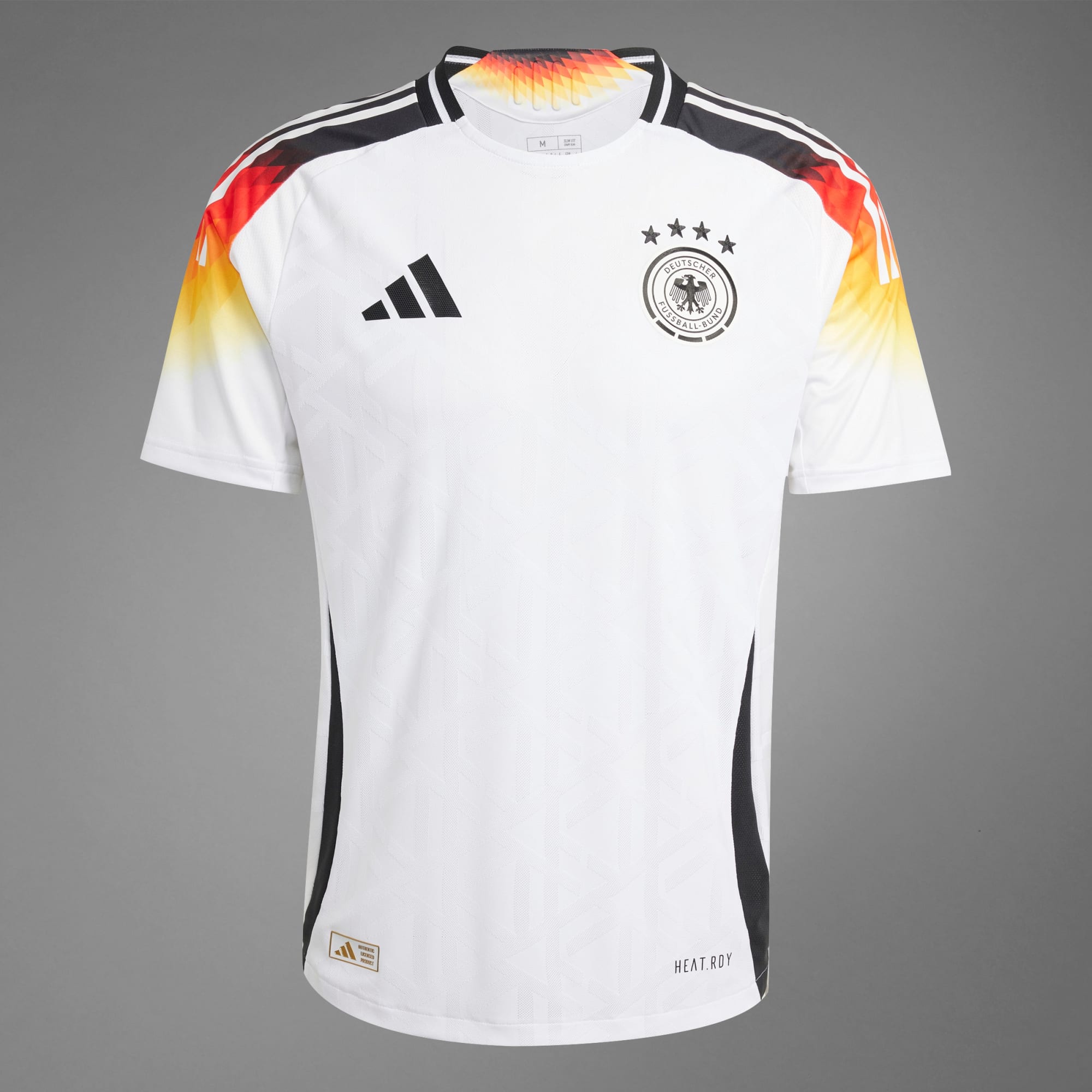 Introducing the new and iconic look for the host of Euro 2024, inspired by Germany's national symbols. Designed for official players to wear on the pitch, the latest adidas football range is a call out for memorable performances, supporting footballers as they push their boundaries on match day. Carry your pride all the way to the stadium in the Germany 2024 Home Authentic Jersey, a super-lightweight piece that brings the German DNA close to your heart. The groundbreaking uniform is crafted from a breathable, moisture-wicking fabric with HEAT.RDY to keep you feeling dry. The slim fit cut adds an extra dose of style as you cheer loudly for die Mannschaft. The main material of the DFB replica jersey is 100% recycled polyester excluding trimming and decoration. The material information on our website only refers to the main material of the jersey. We will update this additional information accordingly.