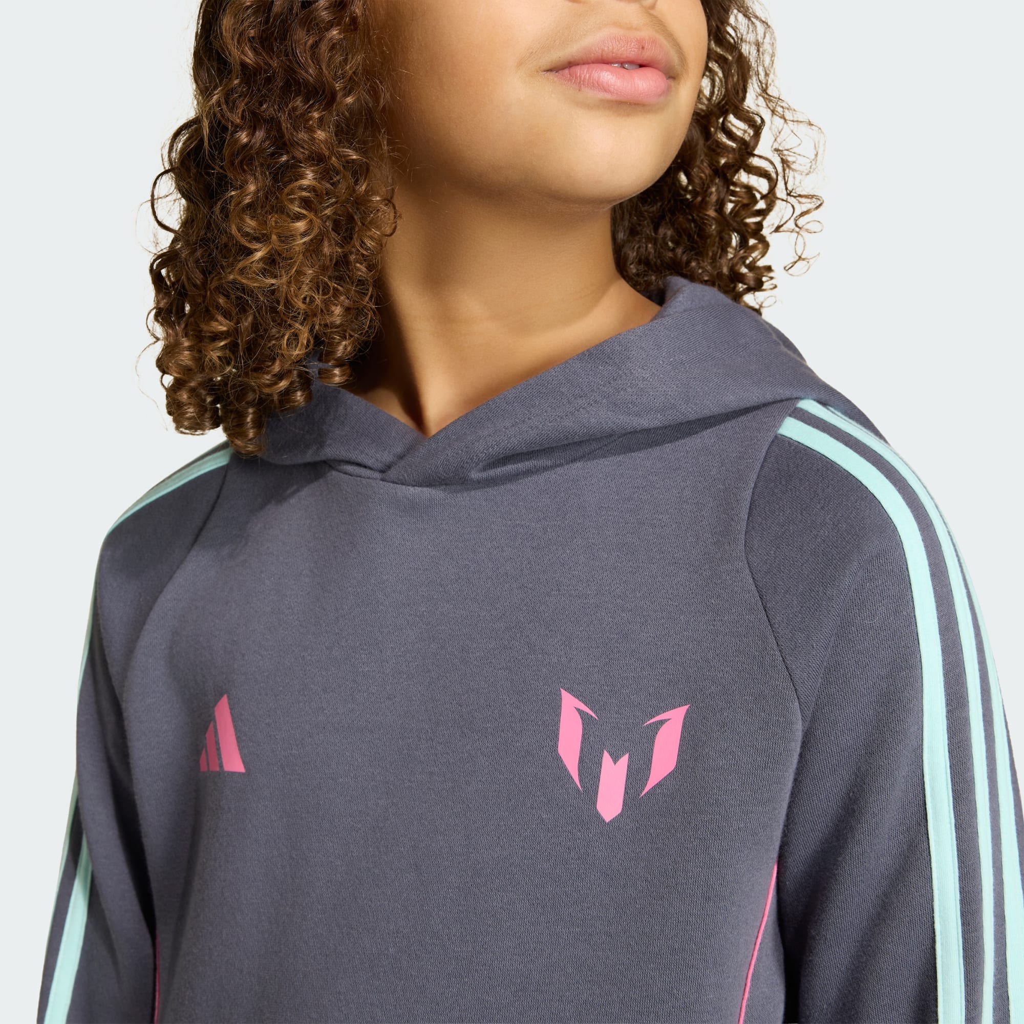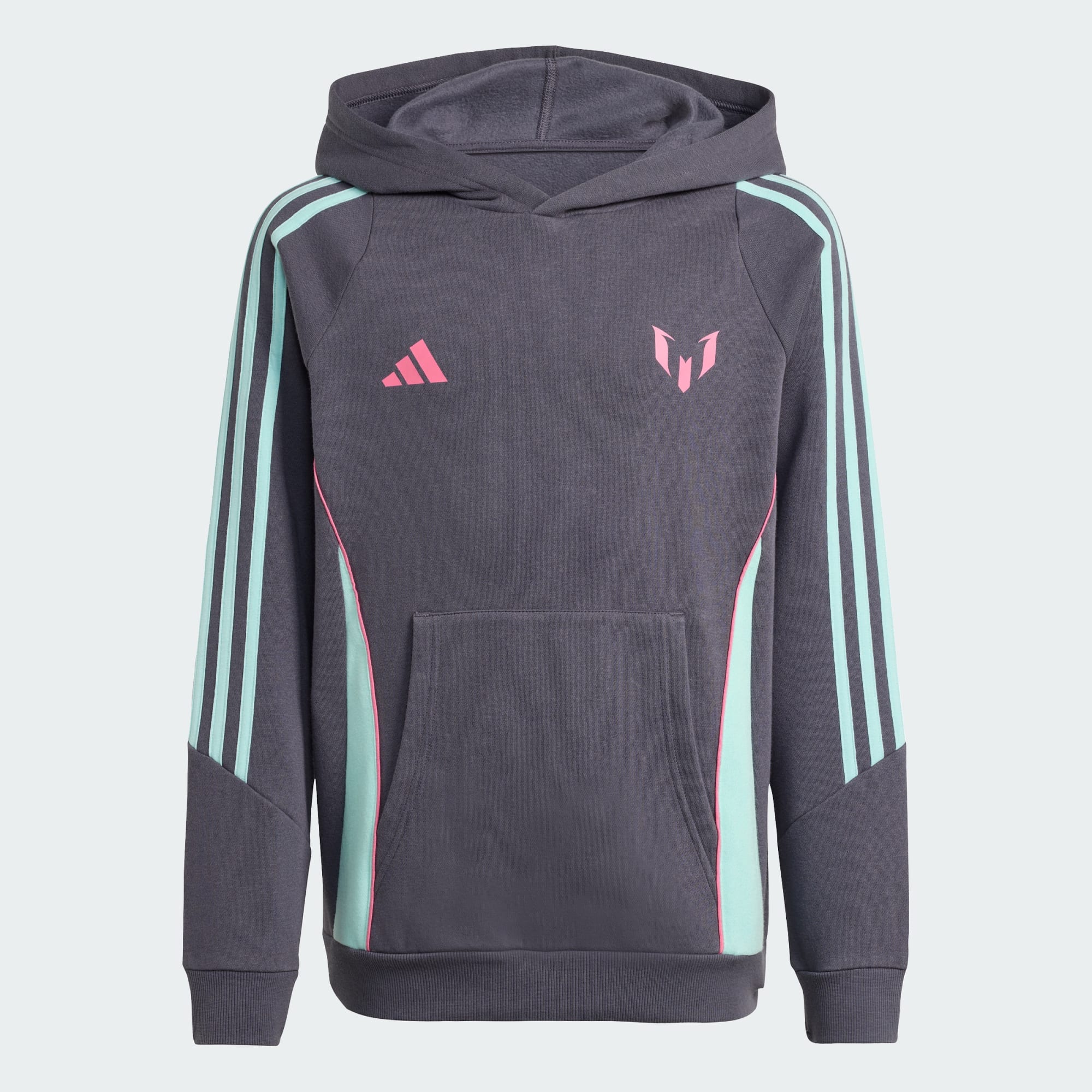 Represent the beautiful game's greatest player. Showing off Messi's iconic logo on the chest, this juniors' adidas hoodie keeps young fans comfortable with soft fleece fabric, a roomy hood and a kangaroo pocket. Pull it on over your favourite team jersey to show you appreciate the finer things in football.