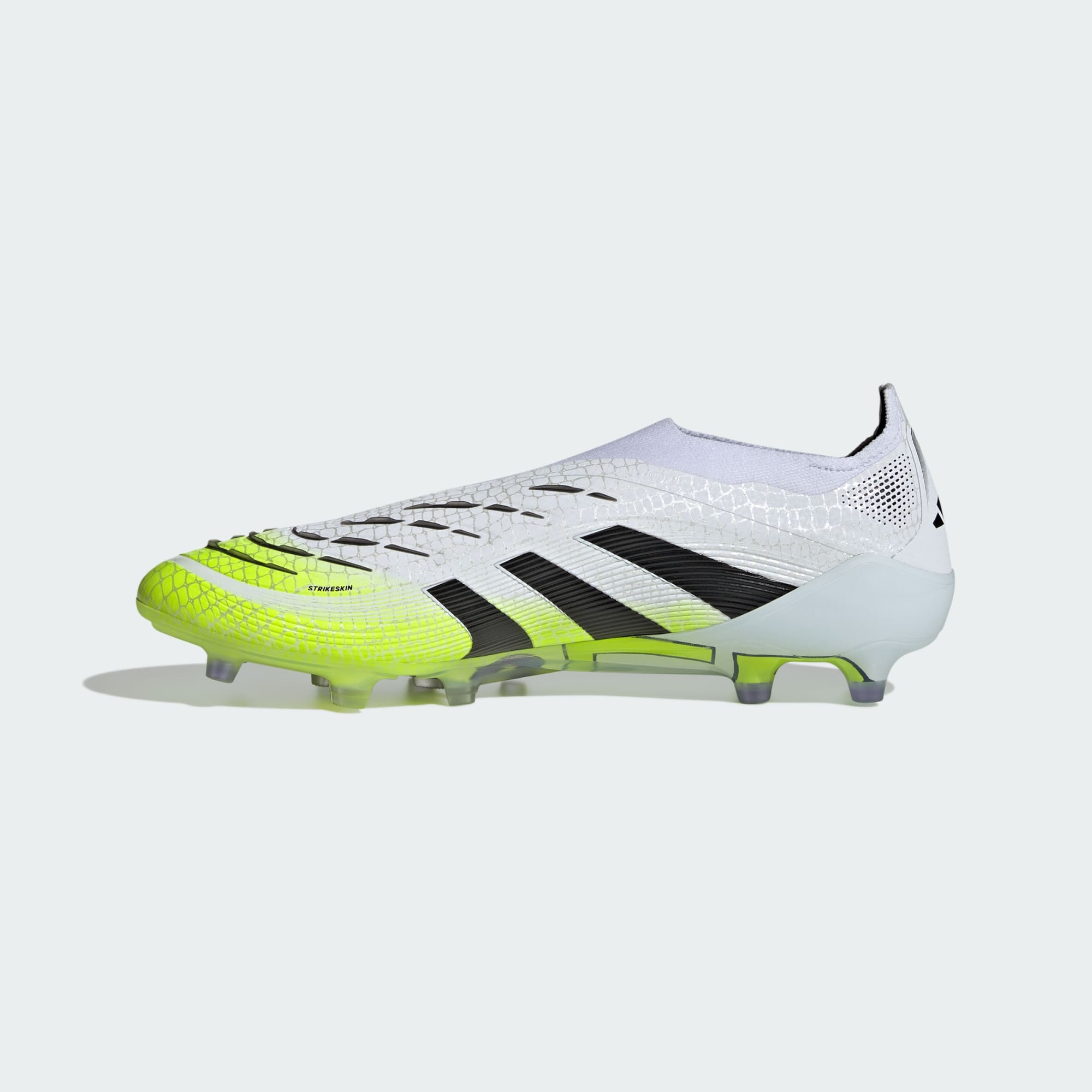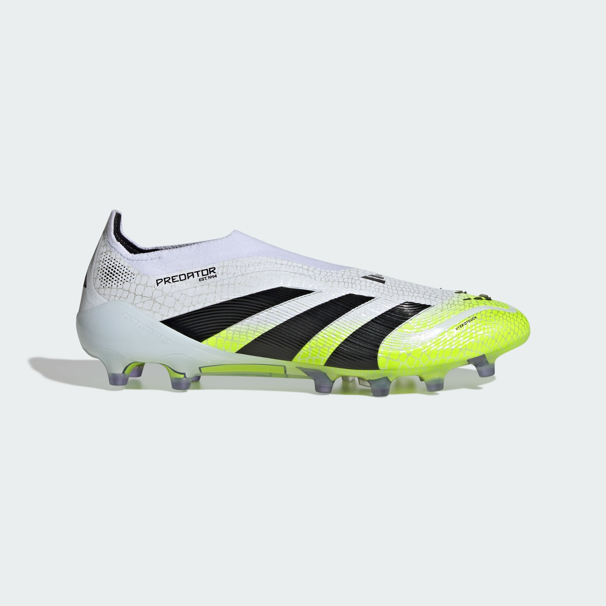 Discover the difference between aiming to score and knowing you will with adidas Predator boots that are crafted for goals. These Elite boots have a HybridTouch upper with strategically placed rubber Strikeskin fins and a laceless construction that help provide perfect contact with the football. The Traxionframe artificial grass outsole and adidas PRIMEKNIT collar are designed to give you a stable stance when the goal's at your mercy.
