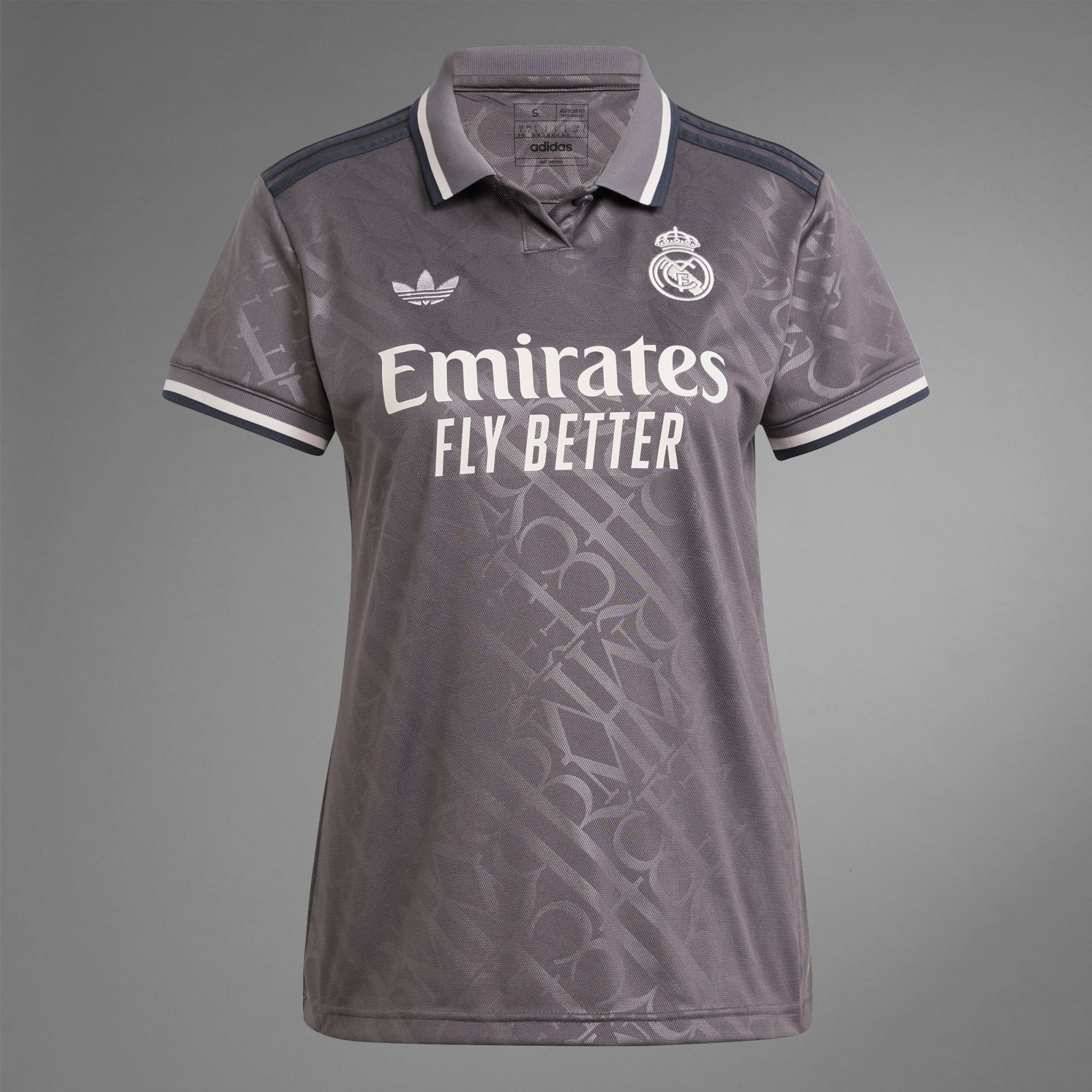 Elegance is their identity. The embossed "RMCF" monograms repeating across this Real Madrid third jersey borrow their distinctive look from the lettering used on traditional Madrid street signs. Standing out from the classy design, the iconic Trefoil returns to an adidas match shirt after a long break. Behind it all, AEROREADY keeps football fans dry and comfortable as they shout their support.This product is made with 100% recycled materials. By reusing materials that have already been created, we help to reduce waste and our reliance on finite resources and reduce the footprint of the products we make.
