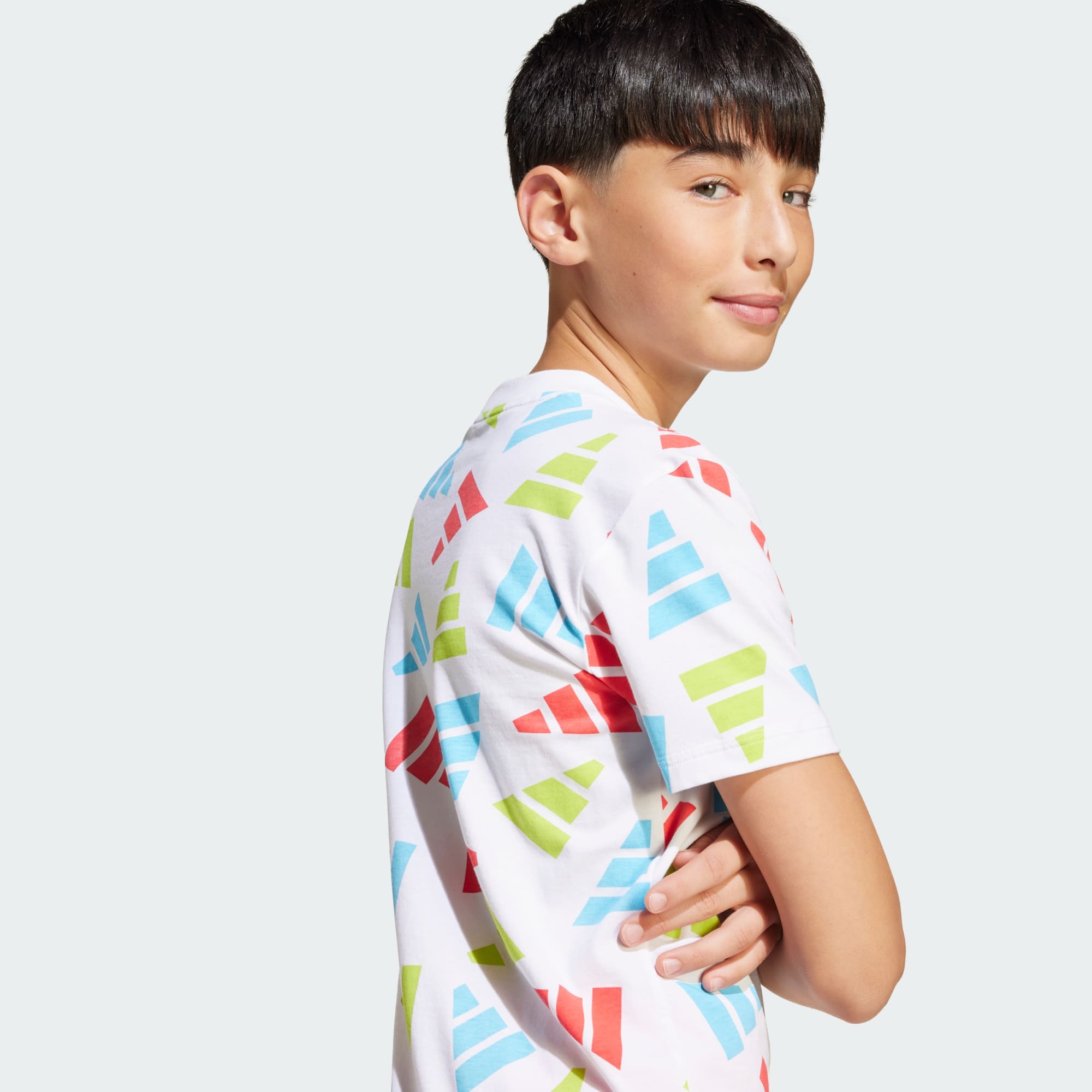 A celebration of the energy of sport, this juniors' adidas t-shirt features an allover print in vibrant colours. The cotton single jersey build keeps you comfortable whether you're hanging out with friends or kicking back at home. Pair it with jeans or sweatpants to bring eye-catching style to any look.