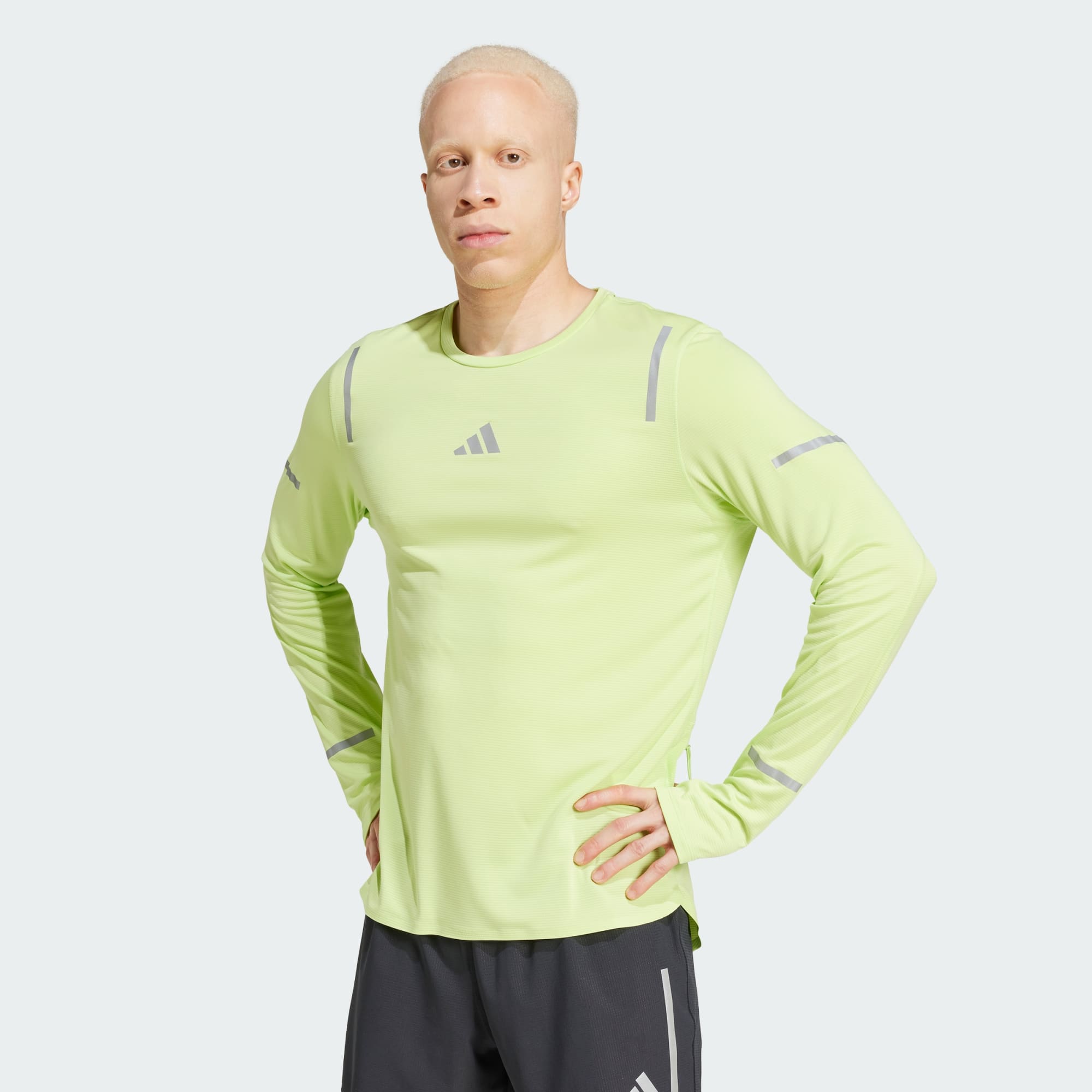 Gear up for morning miles and night runs in this adidas long sleeve running tee. When the light is low, reflective details shine bright. As your pace picks up, CLIMACOOL wicks and disperses sweat for cool, dry and distraction-free performance. Thumbholes help keep sleeves in place as you swing your arms. CLIMACOOL helps you manage sweat with materials that wick and manage sweat quickly. Its fast-dry fibres give you a fresh-skin feel. This product is made with 100% recycled materials. By reusing materials that have already been created, we help to reduce waste and our reliance on finite resources and reduce the footprint of the products we make.