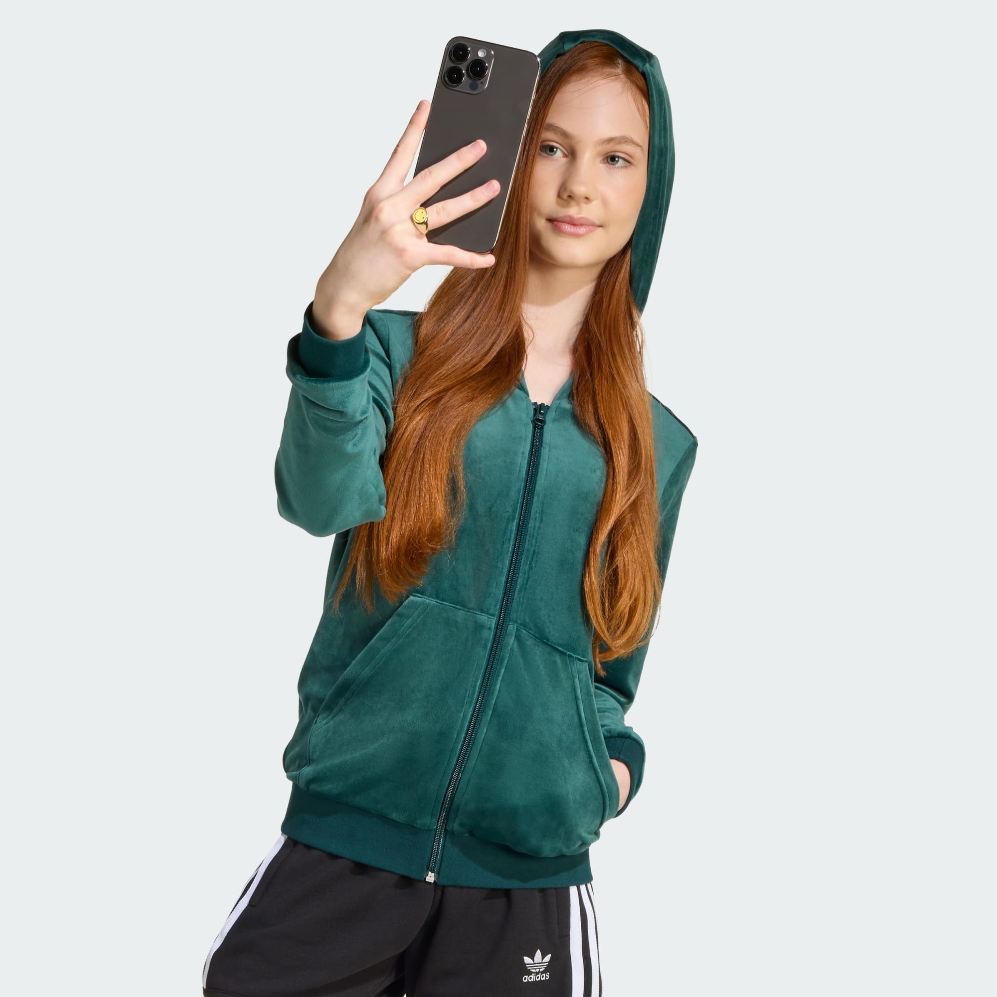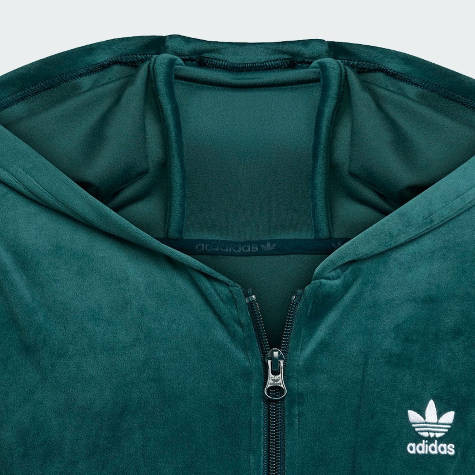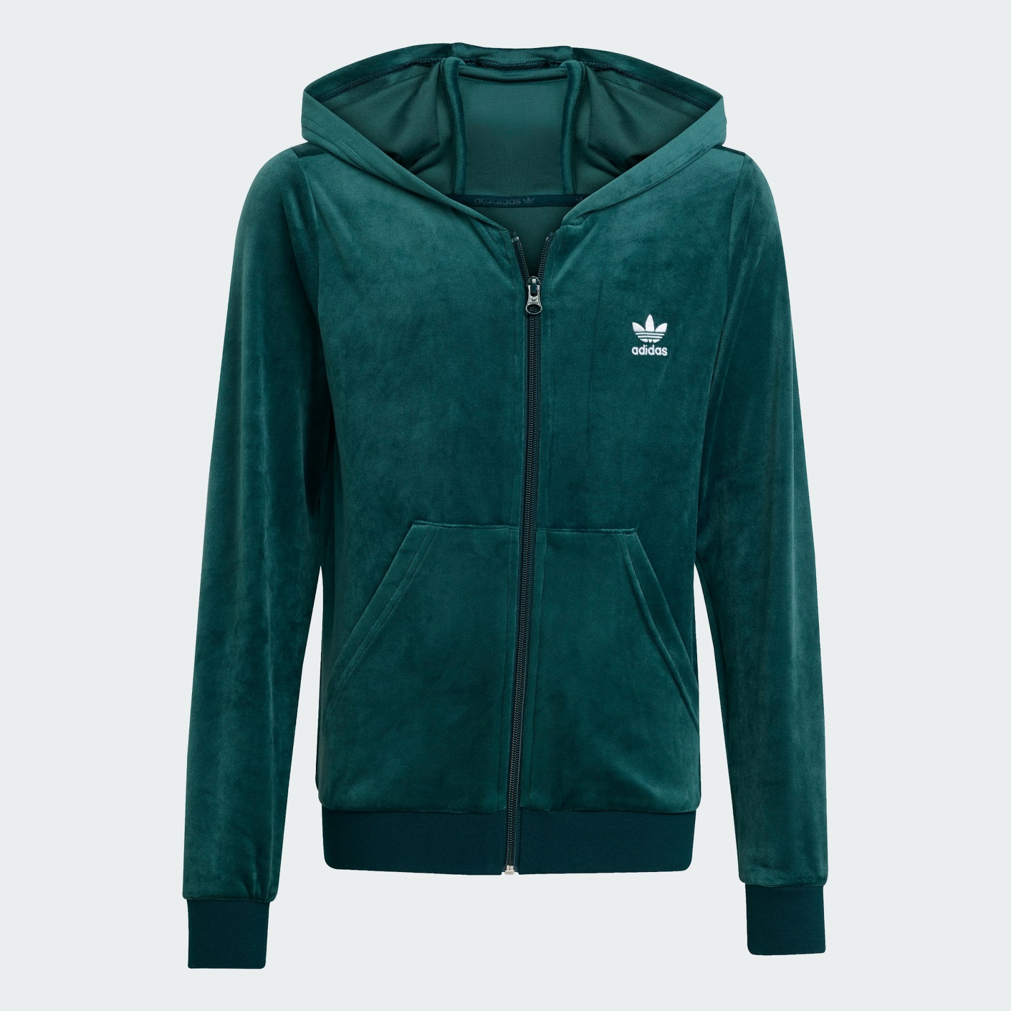This juniors' adidas hoodie is as soft and comfortable as it looks. Made of plush velour, it's perfect for lounging or on-the-go. The slim fit gives it a sleek silhouette. The iconic Trefoil logo on the chest adds a sporty touch.