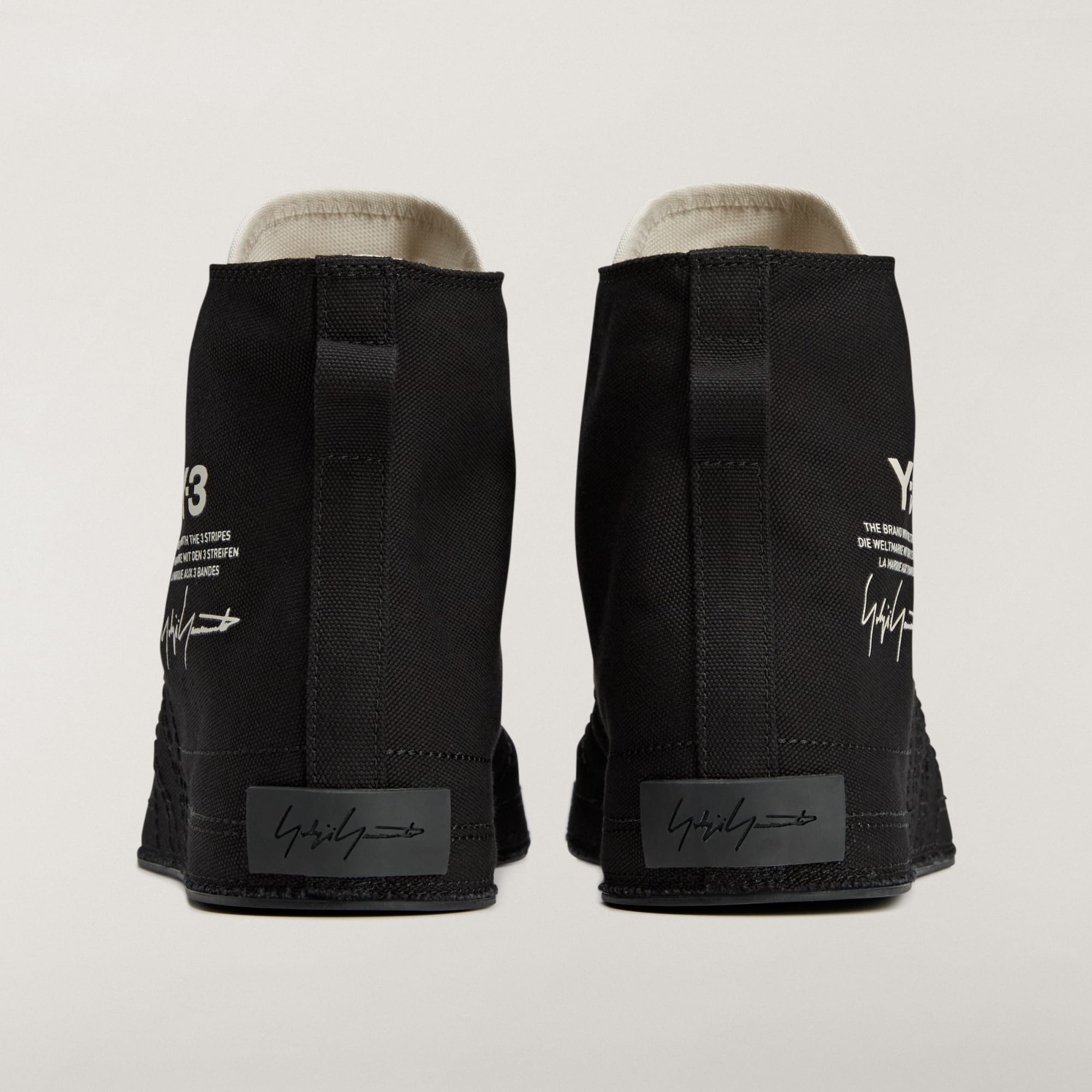 - Y-3 stacked logo graphic on side and Yohji Yamamoto signature on heel patch